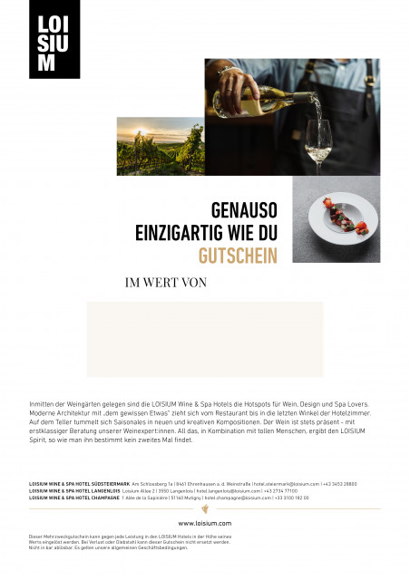 Ein Gutschein. Unzählige Möglichkeiten, Genuss zu schenken. Ob Spa-Moment, kulinarisches Erlebnis, feiner Wein oder eine erholsame Auszeit – mit einem LOISIUM Gutschein verschenken Sie Genussmomente, die bleiben.